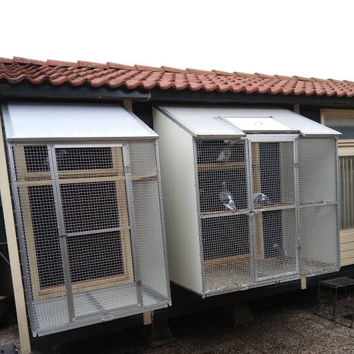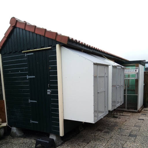 Heb Twee hokken die tegen over elkaar staan,1 hok met puntdak dat op het oosten staat met 24 bakken voor de doffers en een afdeling voor de duivinnen.Nu zitten er 18 doffers en 21 duivinnen